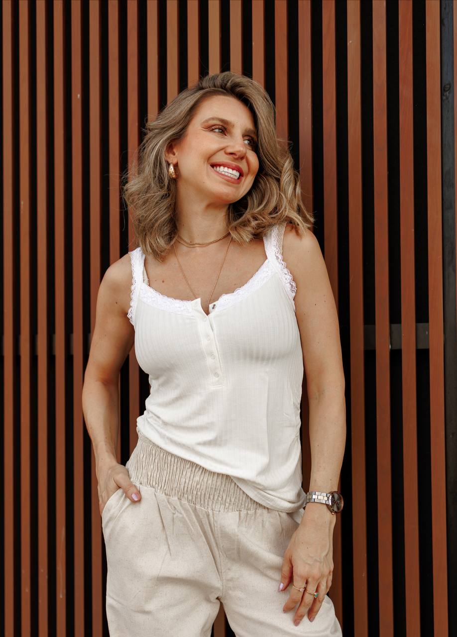 A blusa regata Amili é uma peça básica e super arrumada para criar looks desde a gestacao até o período da amamentação. Feita em malha canelada super macia sem deixar transparente, tem detalhe de renda nas alças e decote com botões que facilitam muito a amamentação.